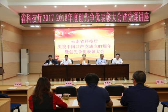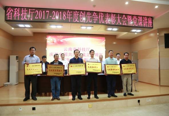 2018年6月29日,云南省科技厅召开2017-2018年度创先争优表彰大会,表彰2017-2018年度创先争优活动中战斗堡垒作用和先锋模范作用发挥突出的优秀共产党员、优秀党务工作者、先进基层党组织、书香支部和书香个人。厅党组书记李松林出席表彰大会并作题为《学习习近平新时代中国特色社会主义科技创新思想提供高质量科技供给全力支撑打造世界一流“三张牌”》的党课报告。厅党组成员关鼎禄副厅长宣读表彰决定。受表彰的优秀个人、先进集体代表作了交流发言。厅党组成员、副厅长、机关党委书记赵志武主持表彰大会。