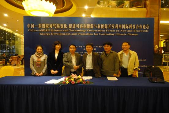 为进一步加强与泰国在可再生能源与新能源方面的合作,2011年11月29日至12月2日在昆明举行的“中国-东盟应对气候变化:促进可再生能源与新能源开发利用国际科技合作论坛”上,云南省科学技术情报研究院与泰国蓝色能源环境有限公司、泰国DBIC有限公司、泰国国际能源环境有限公司分别签署合作协议,就共同在泰国推广新能源与可再生能源的技术和产品、开展太阳能建筑与光伏发电技术应用示范推广等方面开展合作。