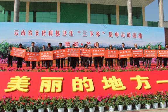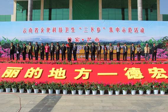 为深入贯彻党的十八大精神,广泛开展文化、科技、卫生“三下乡”活动,推动“桥头堡”建设,根据省委宣传部的统一部署,云南省2012-2013年度文化科技卫生“三下乡”集中示范活动于2012年12月6日在德宏州芒市举行。