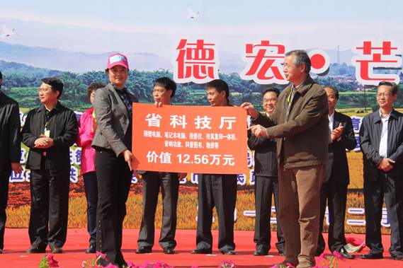云南省科技厅由副厅长李树洁带队,省农村科技服务中心和厅法规处牵头组织云南农业大学、云南省农科院、云南省林科院、昆明食用菌研究所、云南省科技厅宣教中心、云南思力生态替代技术中心、昆明华曦牧业集团等8家单位的领导和专家共32名,在德宏州科技局配合下,于6日在芒市广场参加集中示范活动,此次活动省科技厅捐赠了价值12.56万元的设备及物资,共发放技术资料8000余份,科技书籍3000余册,展出展板30余块,接受现场技术咨询1500余人次。