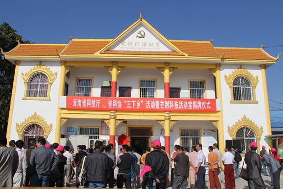 集中示范活动结束后,李树洁副厅长及相关领导在州(市)科技局科协领导陪同下到芒市芒别村委会,与村委会共建社会主义新农村科技活动室。在挂牌仪式上,李副厅长鼓励群众学科技,用科技,早日实现致富奔小康的目标,并向活动室赠送了多功能一体机、DVD、音响、功放、饲料及科普书籍。