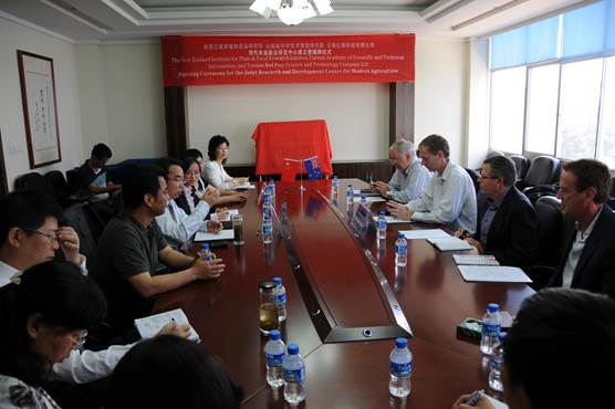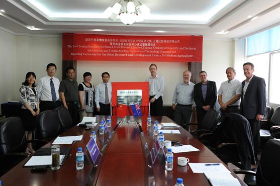 为推进新西兰与云南在现代农业领域的合作,在云南省科技厅的大力支持下,新西兰皇家植物食品研究所与云南省科学技术情报研究院、云南红梨科技有限公司在前期大量工作基础上,就共建现代农业联合研发中心达成了共识。2013年5月20日上午,新西兰皇家植物食品研究所和云南省科学技术情报研究院、云南红梨科技有限公司在省情报院举行了现代农业联合研发中心成立暨揭牌仪式。