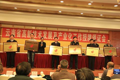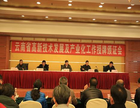 由云南省科技厅主办、省科技发展研究院协办的“云南省高新技术产业化工作授牌颁证会”于2015年2月5日下午在云南经贸宾馆顺利召开。会议由省科技厅侯树谦副厅长主持,省科技厅党组书记、厅长龙江,省财政厅副厅长唐新民,昆明市市委常委、昆明高新区管委会主任王敏正,省科技厅巡视员李树洁出席了会议,并共同为2014年通过认定、复审的高新技术企业,通过国家级科技企业孵化器认定和省级高新区、高新技术产业化基地、生产力促进中心认定的单位,被认定为科技小巨人的企业授牌,为被评为火炬计划重点高新技术企业、被列为国家重点新产品开发计划的企业颁发证书。会上,龙江厅长通报了2014年云南省高新技术产业化工作情况及2015年工作重点。