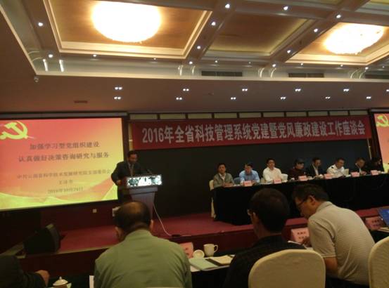 根据省科技厅党组和厅机关党委安排,省科技发展研究院在10月24日召开的2016年全省科技系统党建暨党风廉政建设工作座谈会上,作为唯一一家省科技厅直属单位代表作了大会交流发言。省科技发展研究院王泽华院长代表院党支部以“加强学习型党组织建设认真做好决策咨询研究与服务”为题,从基层党建夯实工程、创新文化建设工程、年度主题建设工程、创新团队建设工程、特色研究品牌建设工程、制度体系建设工程等6方面,对近年来在省科技厅党组、厅机关党委及各位领导的关怀下,省科技发展研究院在学习型党组织建设、基层党建工作、决策咨询研究、支撑服务工作等方面所做的工作和取得的成绩做了交流发言。