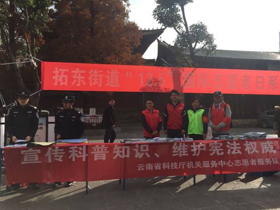 12月4日是国家“宪法日”,12月5日是“国际志愿者日”。为弘扬科学精神,普及科学知识,学习贯彻党的十九大精神,维护宪法权威,2017年12月5日,省科技厅机关服务中心志愿者服务队,参加了盘龙区拓东街道“12.5”国际志愿者日系列志愿服务活动。